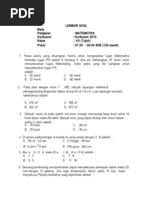 Soal Matematika Kelas 7 K13 Pdf from imgv2-2-f.scribdassets.com Rasio waktu yang diluangkan karina untuk mengerjakan tugas matematika terhadap tugas ipa adalah 5 banding 4 jika dia mengeluarkan 40 menit untuk menyelesaikan tugas matematika maka waktu yang dia luangkan untuk menyelesaikan tugas ipa adalah. We did not find results for: Check spelling or type a new query. Maybe you would like to learn more about one of these?