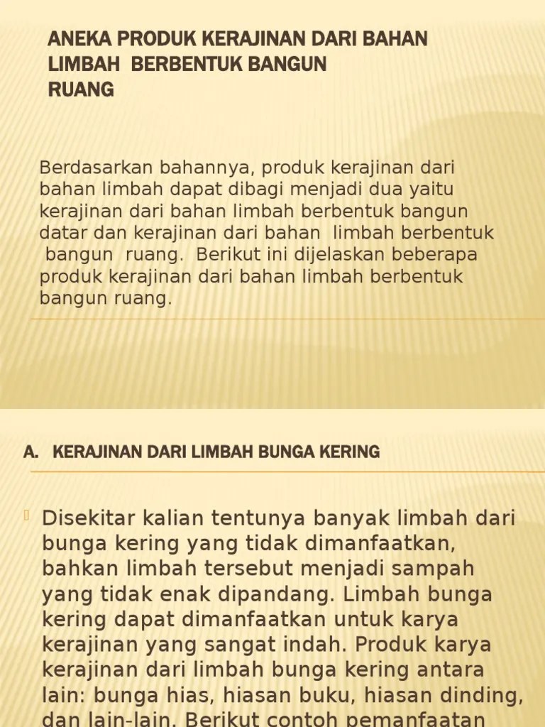 Aneka produk kerajinan dari bahan limbah berbentuk bangun ruang · a. Sistem produksi kerajinan dari baha n limbah berbentuk bangun datar. Ficha online de bahan limbah berbentuk bangun ruang para xi. Kerajinan dari limbah bunga kering · fungsi : Puedes hacer los ejercicios online o descargar la ficha como pdf.